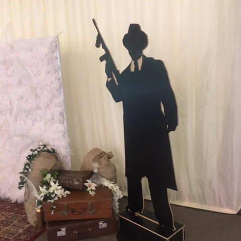 Silhouette cut outs of speakeasy signs, flapper girls, tommy guns and gangsters